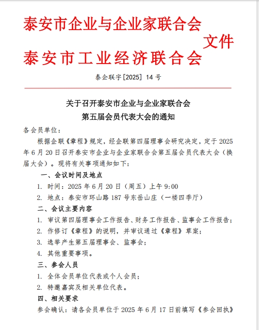 召開泰安市企業(yè)與企業(yè)家聯(lián)合會第五屆會員代表大會